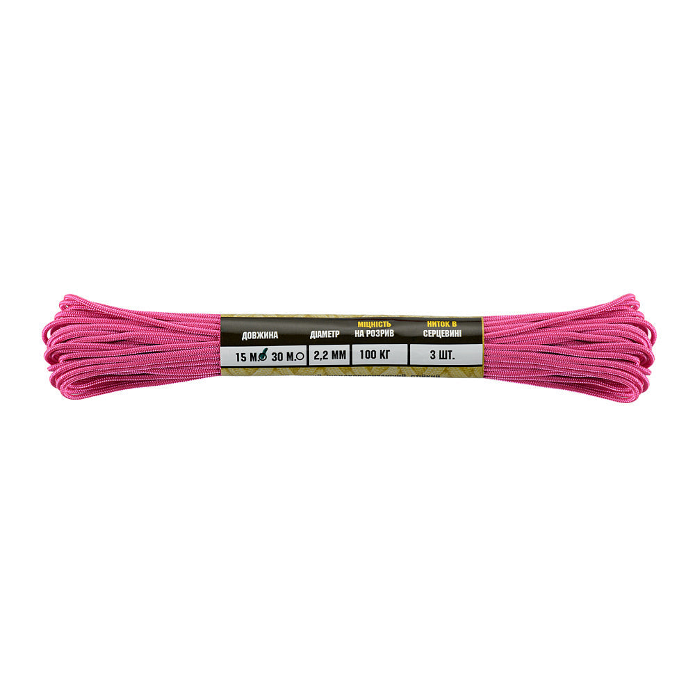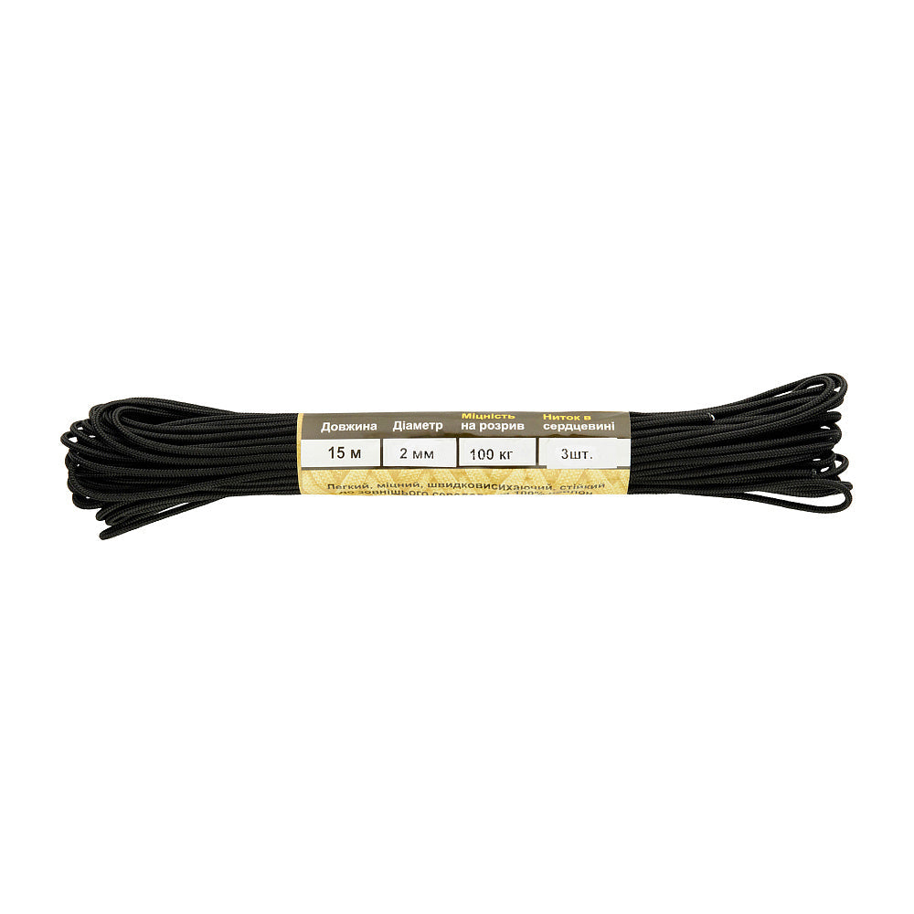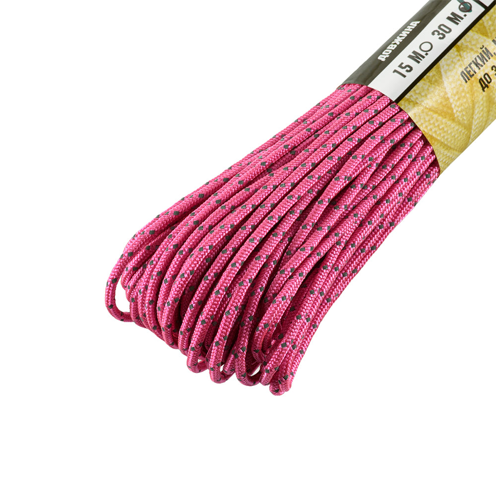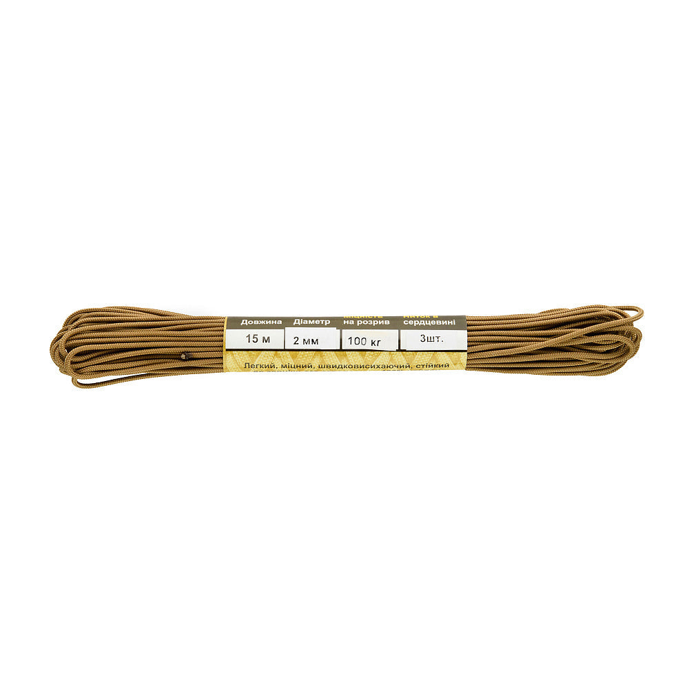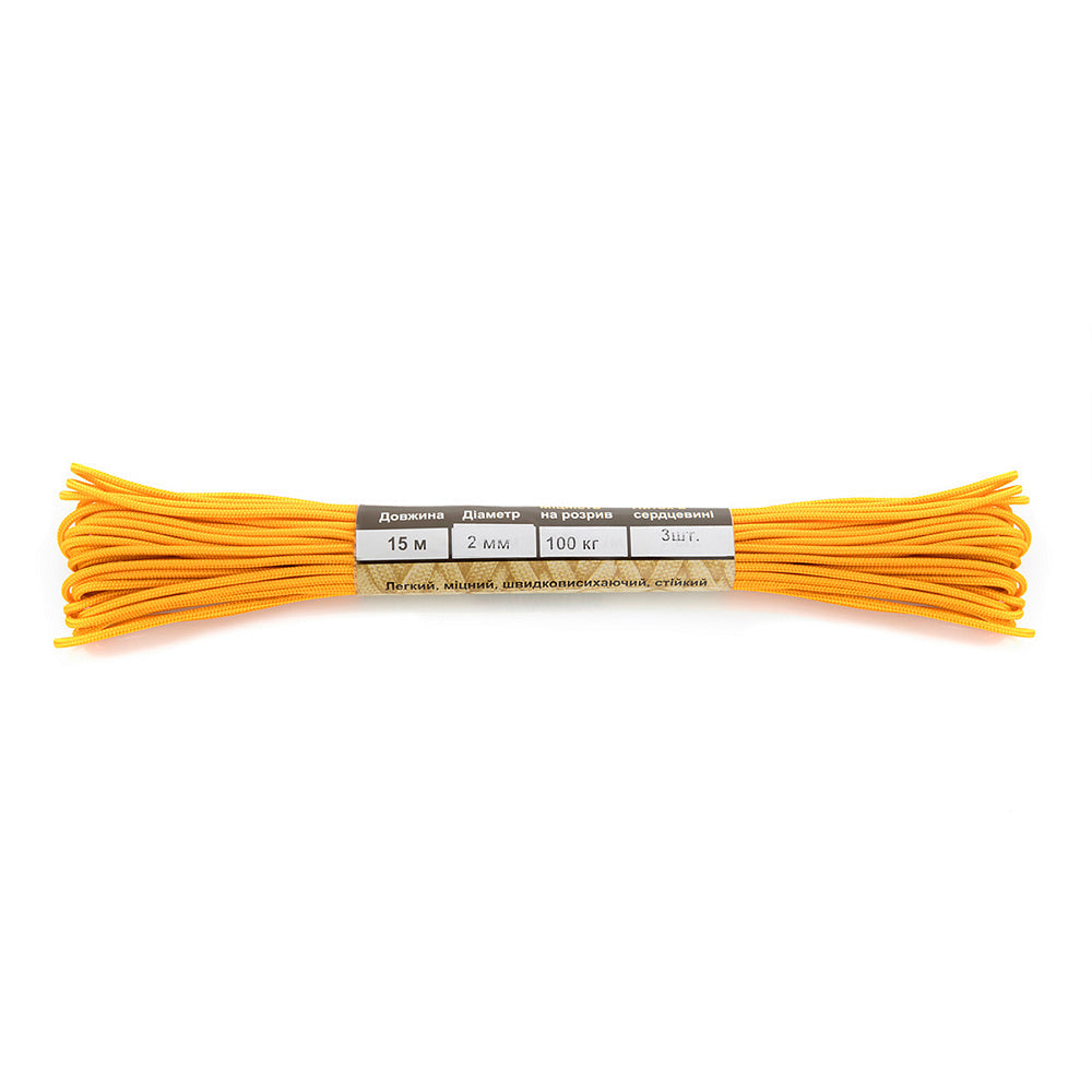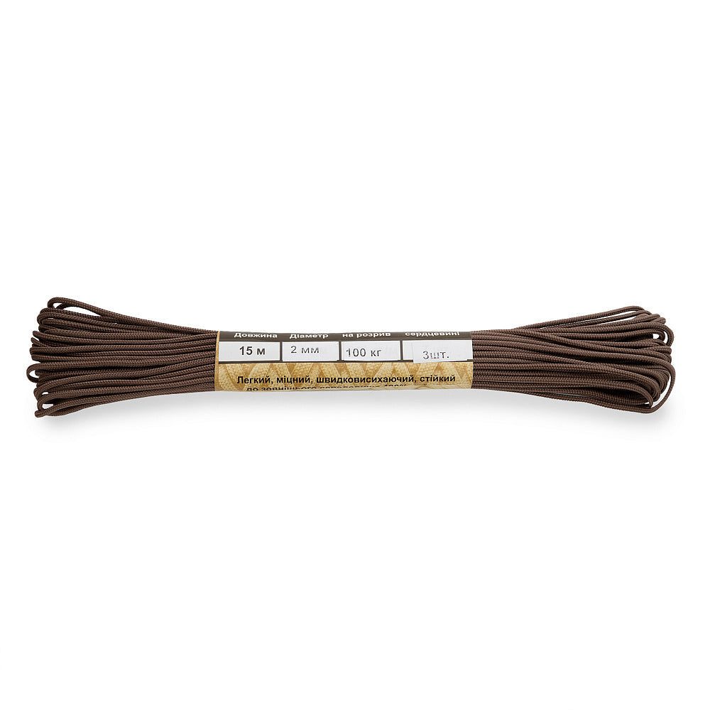 It is made of 100% nylon — a lightweight yet highly wear-resistant material. The cord consists of a reinforced outer braided sheath and an inner core, which together provide high tensile strength while keeping weight to a minimum. For ease of use and storage, the paracord is supplied on a pressed cardboard spool.