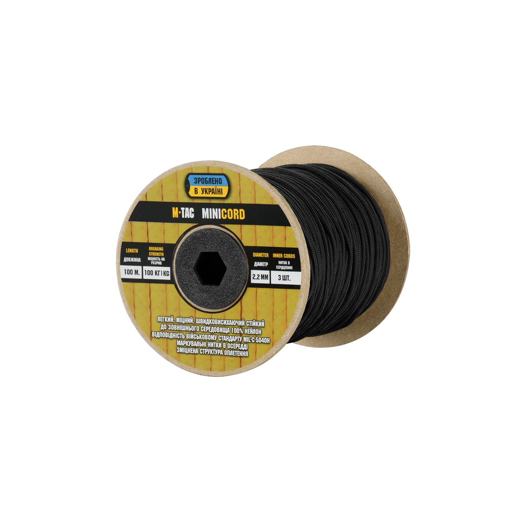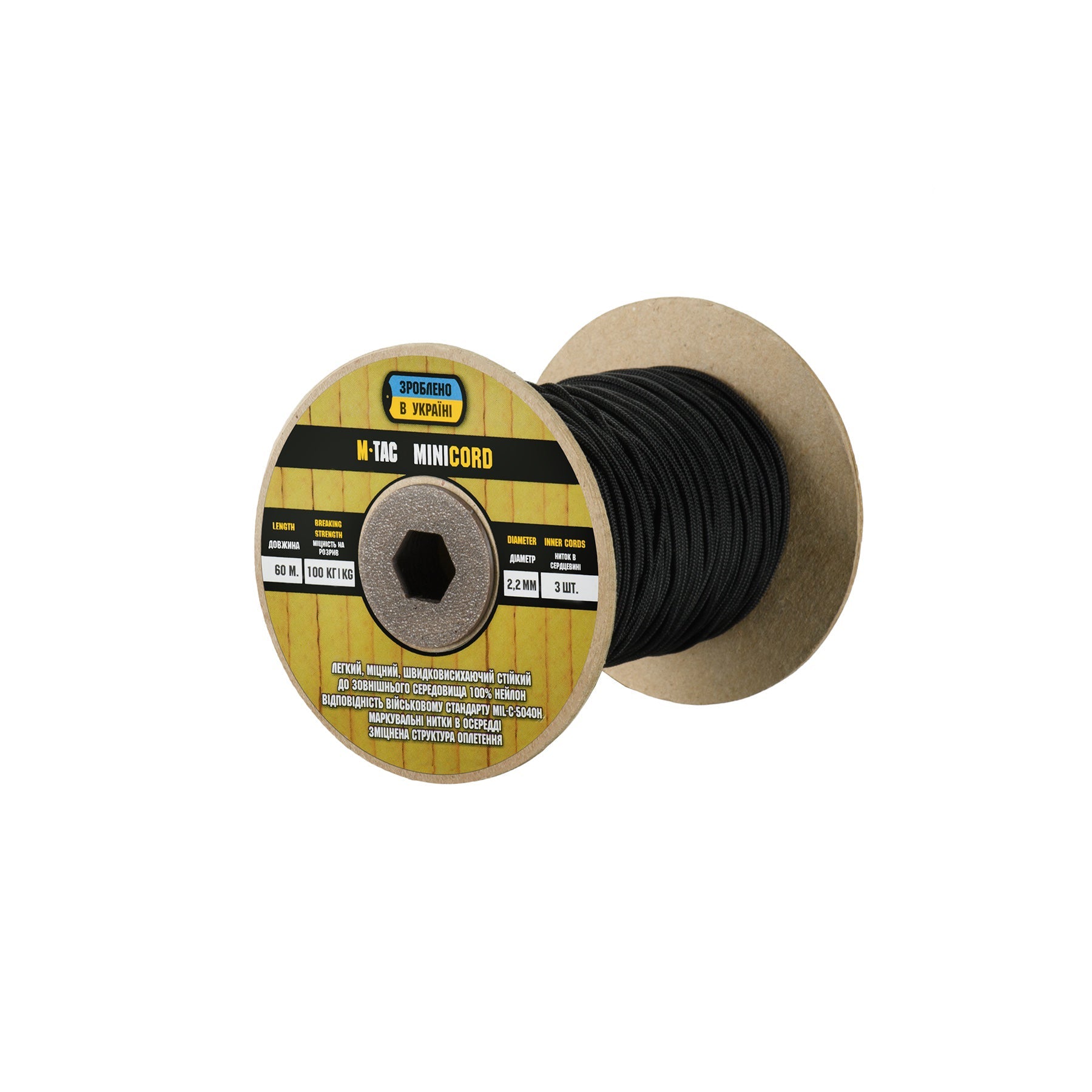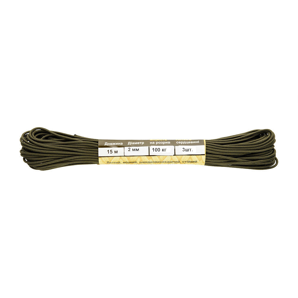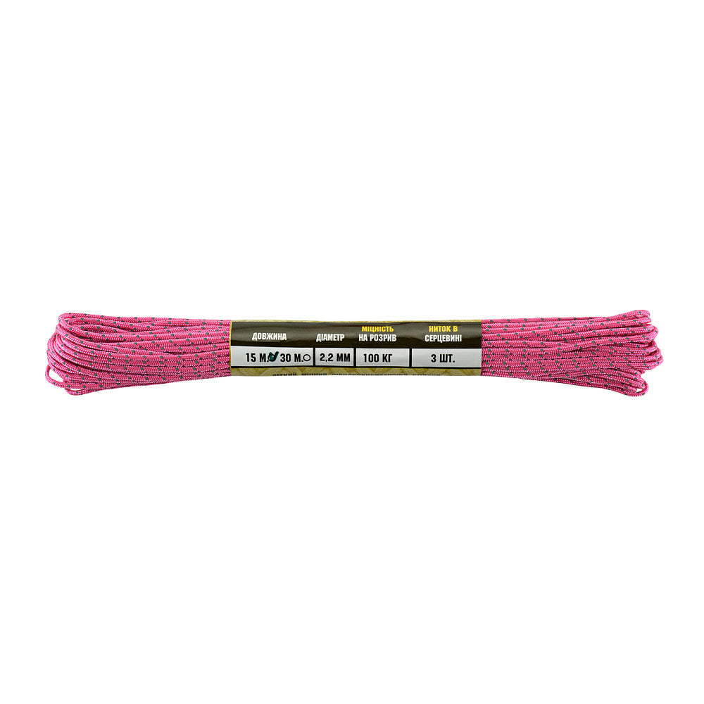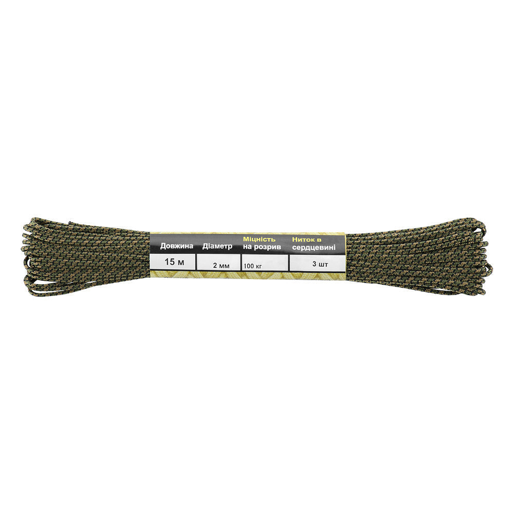 It is made of 100% nylon — a lightweight yet highly wear-resistant material. The cord consists of a reinforced outer braided sheath and an inner core, which together provide high tensile strength while keeping weight to a minimum. For ease of use and storage, the paracord is supplied on a pressed cardboard spool.