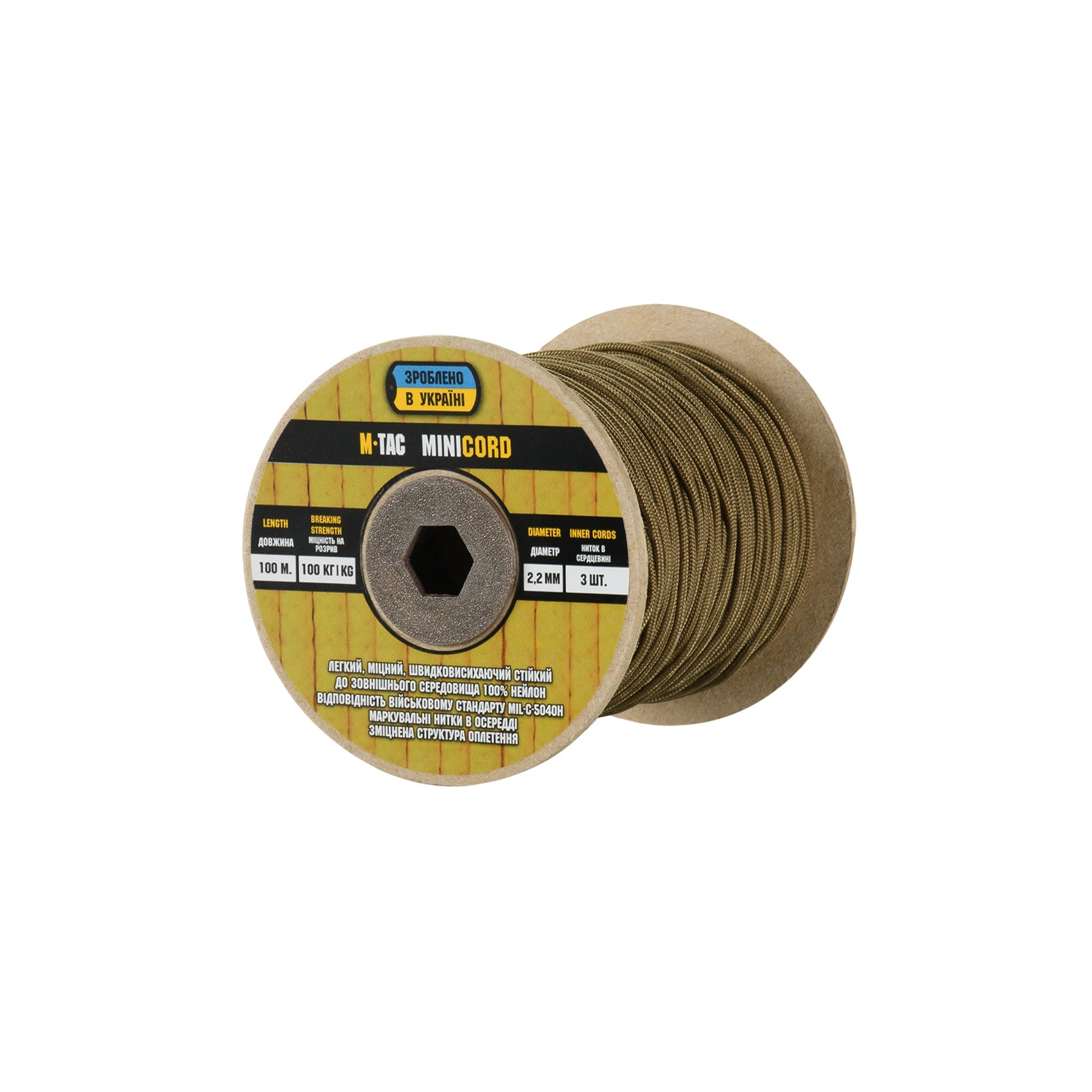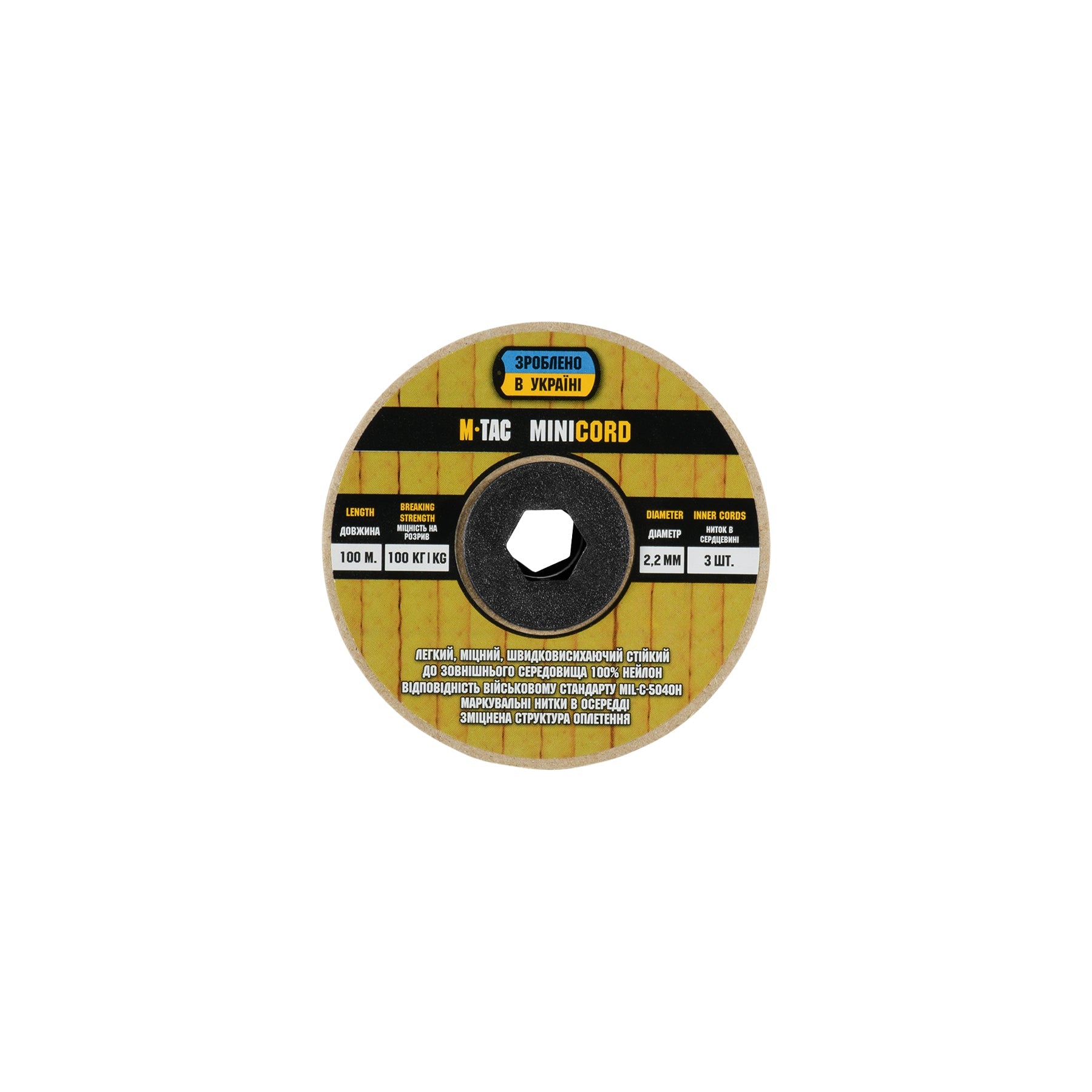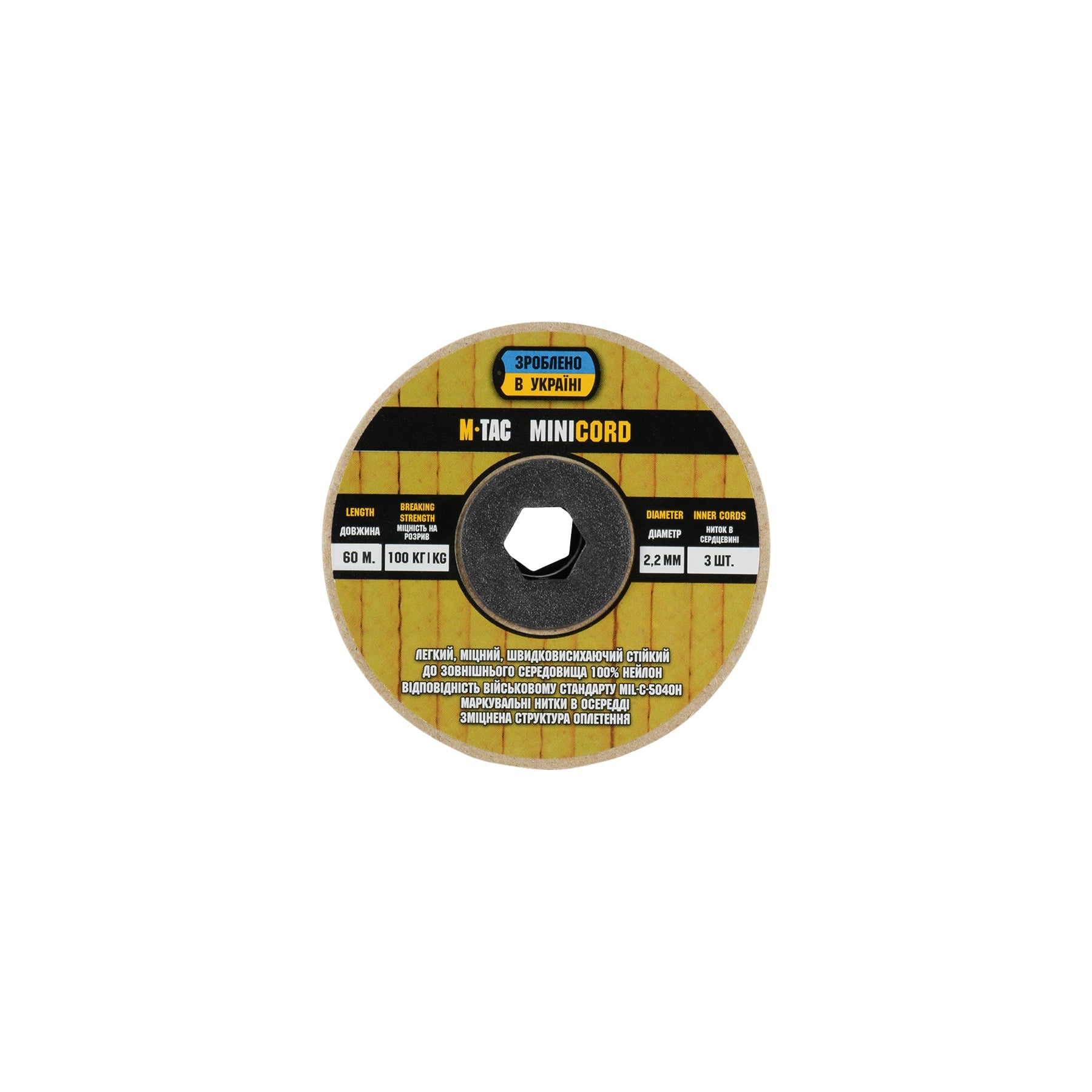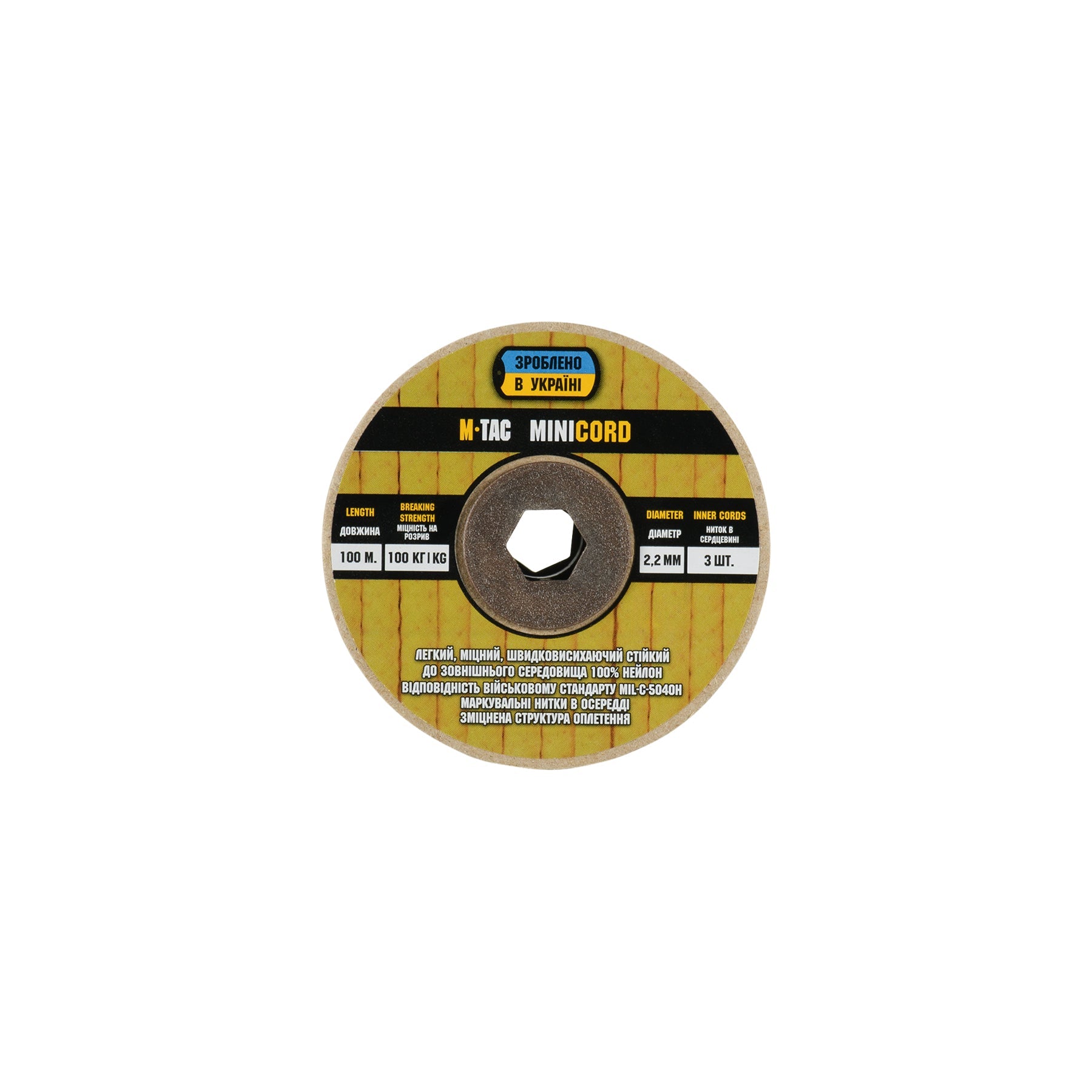 It is made of 100% nylon — a lightweight yet highly wear-resistant material. The cord consists of a reinforced outer braided sheath and an inner core, which together provide high tensile strength while keeping weight to a minimum. For ease of use and storage, the paracord is supplied on a pressed cardboard spool.