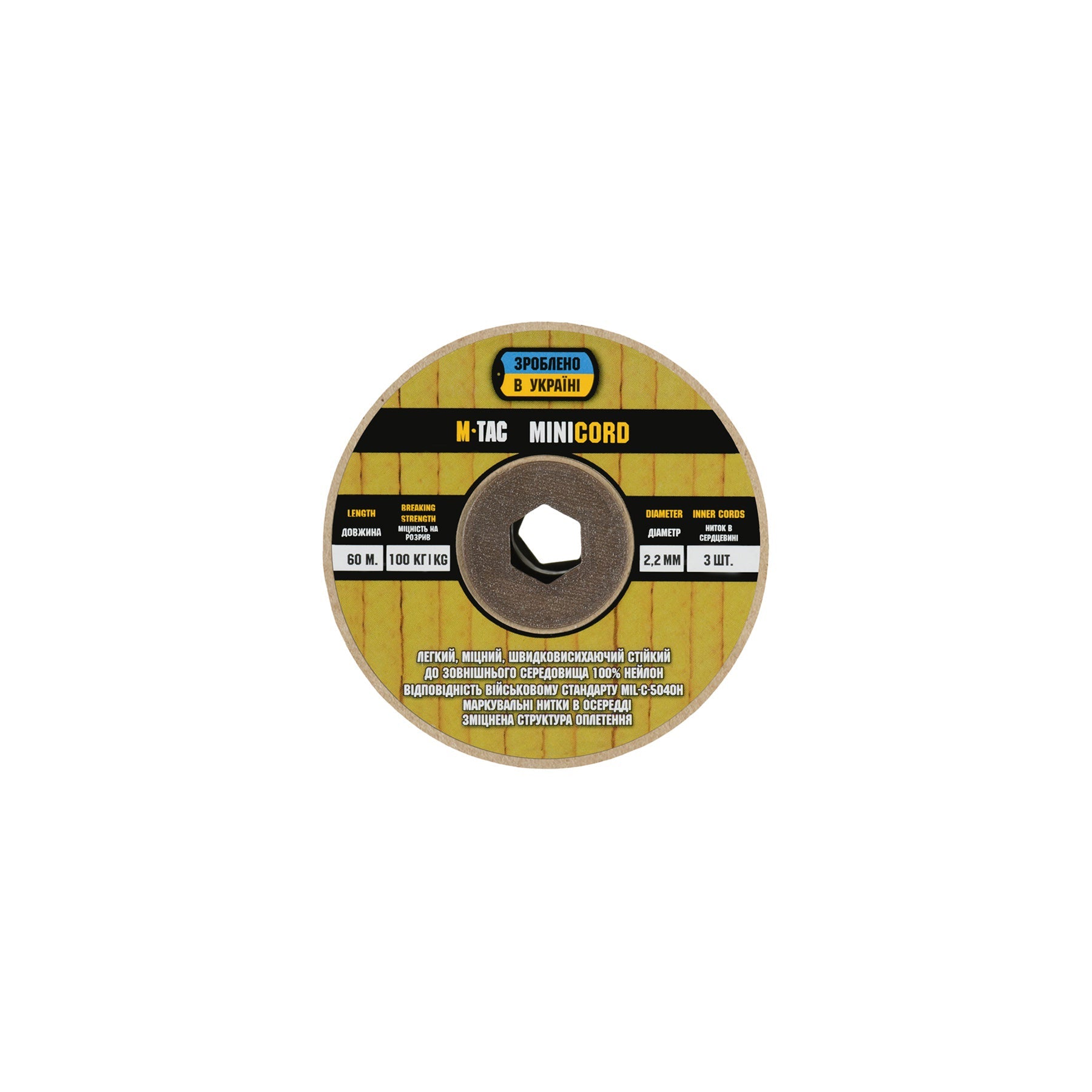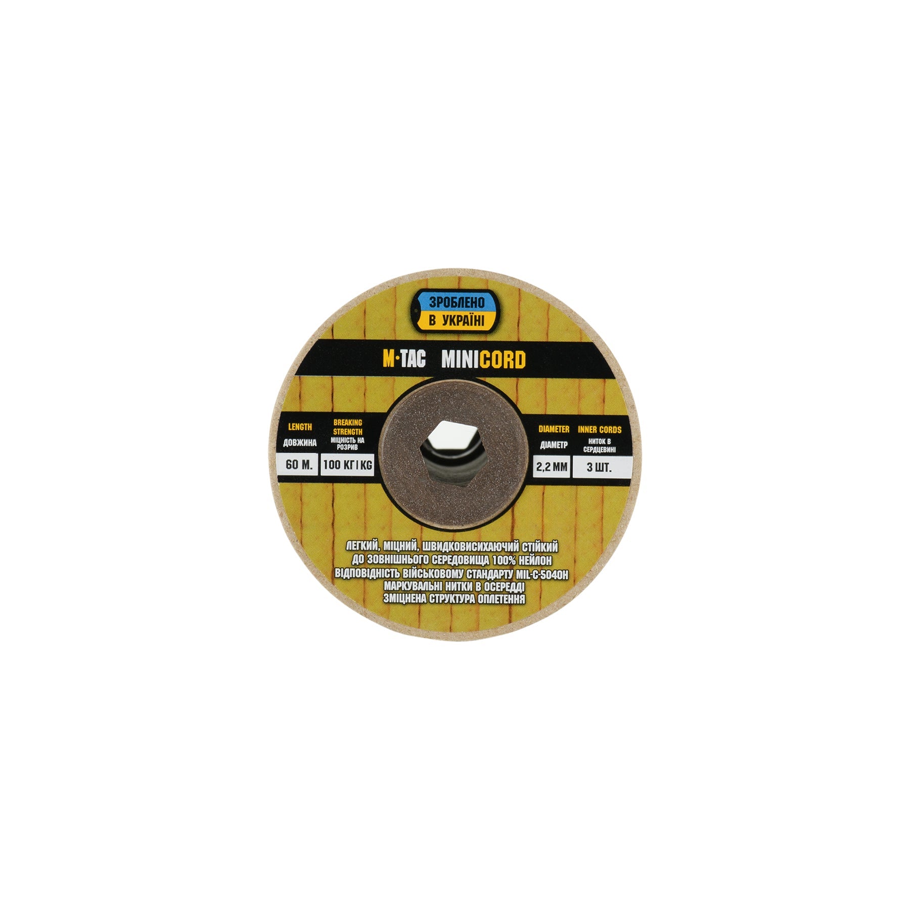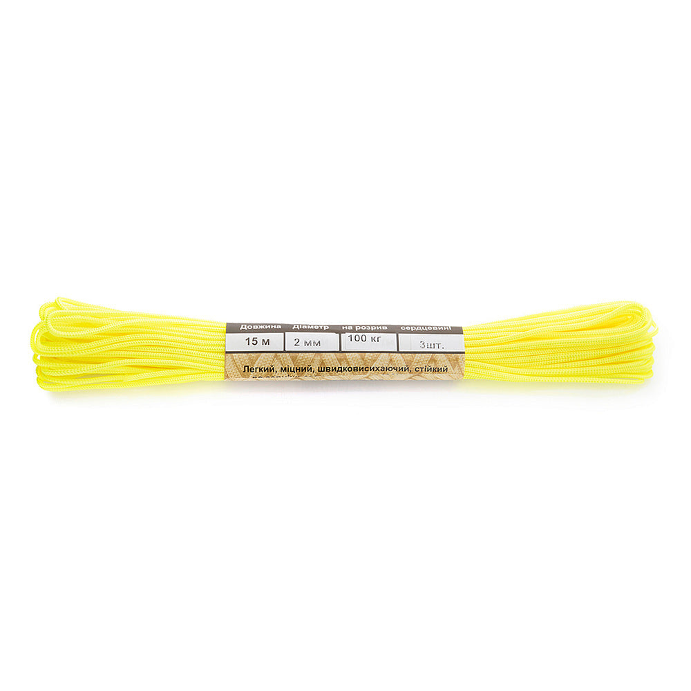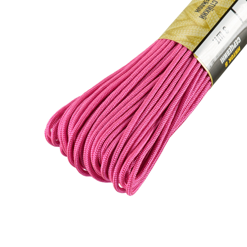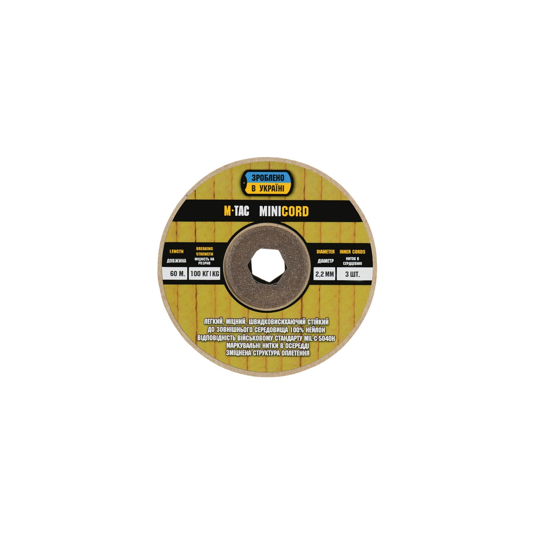 It is made of 100% nylon — a lightweight yet highly wear-resistant material. The cord consists of a reinforced outer braided sheath and an inner core, which together provide high tensile strength while keeping weight to a minimum. For ease of use and storage, the paracord is supplied on a pressed cardboard spool.