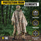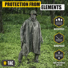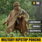 The copy of an American poncho made by the M-Tac brand. Material - 100% polyamide. Fabric - Rip-Stop. Complete set - poncho and portable bag. The product itself has universal functionality. It can be used as outerwear in the form of a raincoat, awning, or tent - a temporary shelter. The product has buttons, eyelets, and tension ropes.