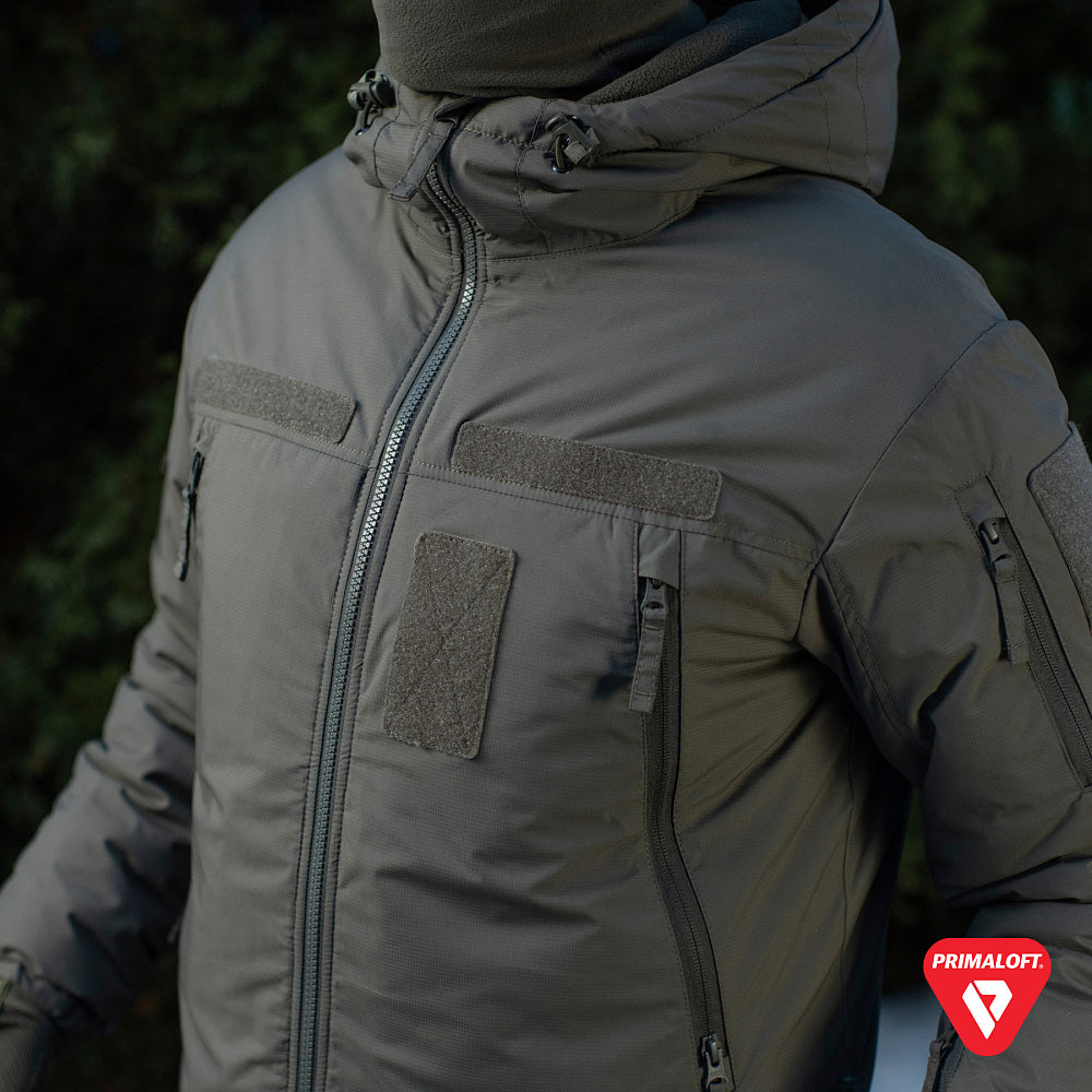 The Tactical Winter Jacket Alpha Gen.IV is made from a water-repellent 10,000x8,000 membrane fabric with a nylon layer and a lightweight polyamide lining, this jacket is both functional and comfortable. The insulation is provided by Primaloft 170 g/m², a high-tech material that ensures excellent thermal protection while remaining lightweight, breathable, and quick-drying. It effectively wicks away moisture, offering the softness of down with the durability of synthetic fibers.