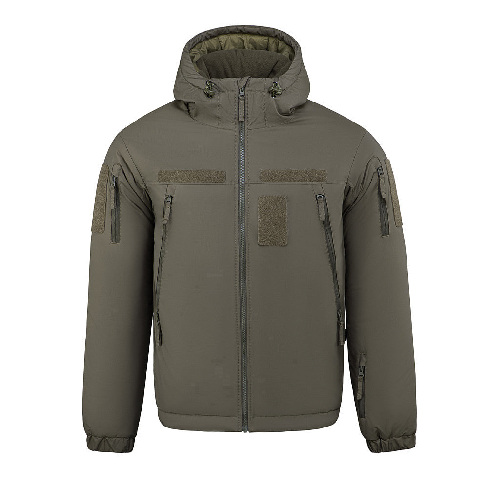 The tactical winter jacket for men features a non-removable insulated hood adjustable in height and volume, elastic cuffs that keep out the cold, and a hem adjustable with an elastic drawcord and stopper. Side pockets are lined with fleece for extra warmth, while additional VELCRO® Brand panels allow for attachment of patches and identifiers.